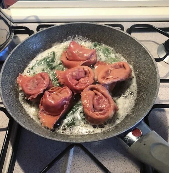 Ravioli radicchio rosso, speck, burro e salvia